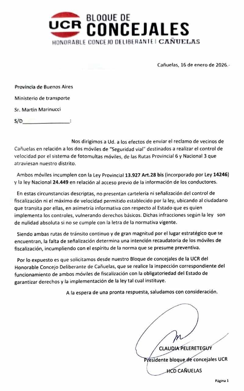 La concejal Claudia Pelereteguy, integrante del bloque de la UCR, acaba de enviar una carta al ministro de Transporte de la Provincia, Martín Marinucci, para solicitar una inspección sobre el sistema de radares desplegado en el territorio de Cañuelas.