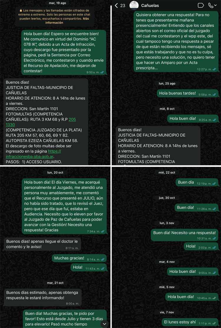 Antes de promover la demanda, Carvajal realizó un descargo vía web con fecha de 9 julio de 2025 y una apelación, que no fue respondida. Luego, entre el 19 de agosto y el 7 de noviembre de 2025, procuró en 19 oportunidades comunicarse con el Juzgado de Faltas de Cañuelas. Recién el 8 de octubre, luego de una decena de intentos fallidos, un empleado del organismo le dijo que ni bien tuviera una respuesta del juez, se la transmitiría, algo que nunca sucedió.