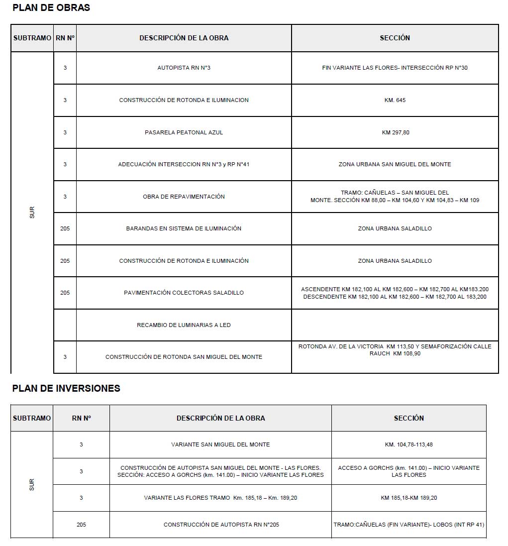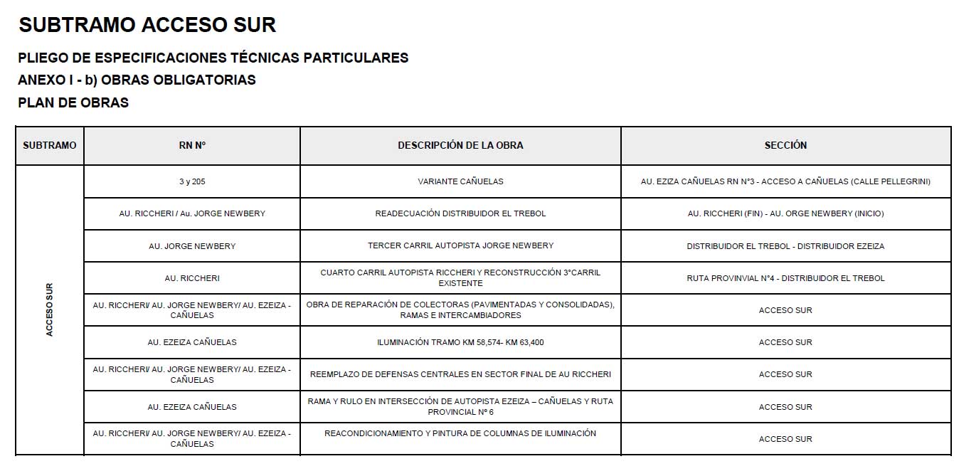 El listado incluye la finalización de la Variante que va desde la Autopista Ezeiza Cañuelas hacia la Ruta 3; y una readecuación del distribuidor El Trébol en Ezeiza, punto de frecuentes embotellamientos.