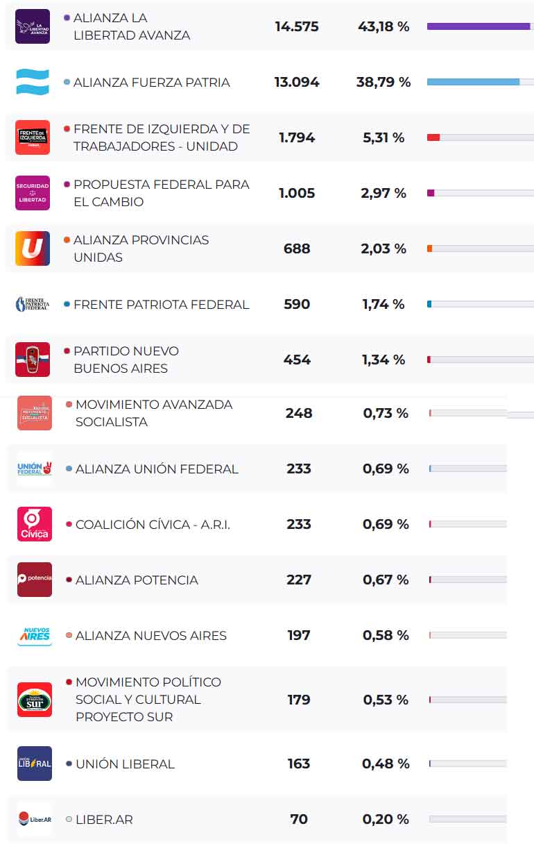 Con el 95 % de urnas escrutadas, La Libertad Avanza obtiene 15.575 votos (43,18 %) superando por casi 5 puntos a Fuerza Patria.