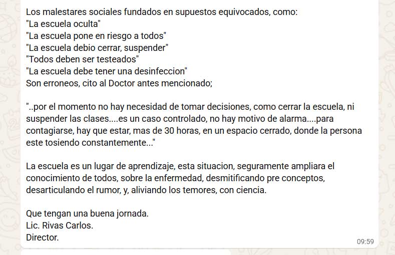 “Buenos días Estudiantes, esta Dirección, comunica a Ustedes que no se justificarán inasistencias, por supuestos temores y preocupaciones, argumentados en falsos rumores de riesgo sanitario. Si la institución se encuentra abierta, es porque no existe peligro, caso contrario, se tomarían las decisiones necesarias, como siempre se hizo. Enfóquense en sostener su escolaridad” fue parte del primer comunicado que salió el martes a la mañana.
