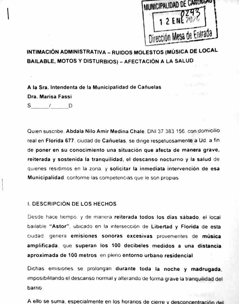 Medina, con domicilio en la calle Florida 677, realizó el primer reclamo el 12 de enero mediante una nota que presentó en Mesa de Entradas de la Municipalidad de Cañuelas. Allí expresó que “desde hace tiempo y de manera reiterada, todos los sábados el local bailable Astor, ubicado en la intersección de Libertad y Florida, genera emisiones sonoras excesivas provenientes de música amplificada que supera los 100 decibeles medidos a una distancia aproximada de 100 metros, en pleno entorno urbano residencial”.