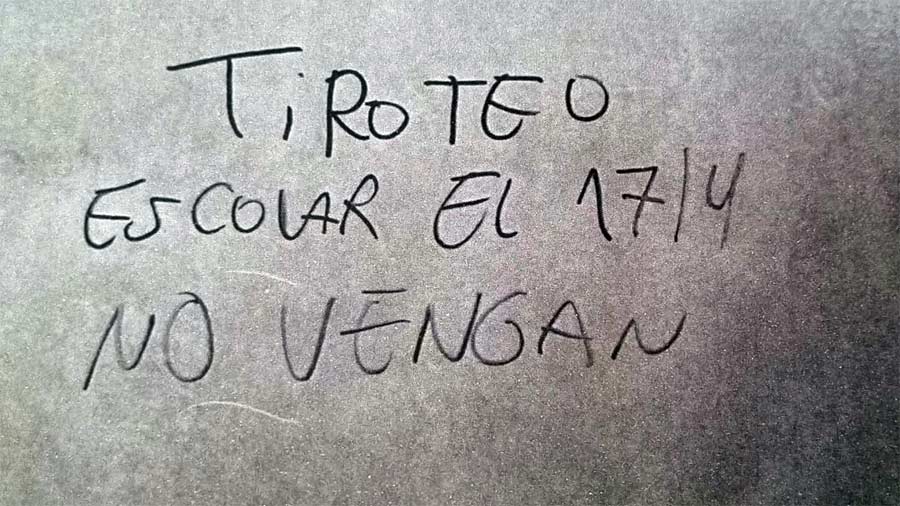 El 16 de abril, en horas de la noche, el vicedirector del complejo Santa María, Sergio Gabriel Da Cruz, denunció que en el baño de varones se constató una inscripción en pared que reza: “Tiroteo escolar. EL 17/4 No vengan”.