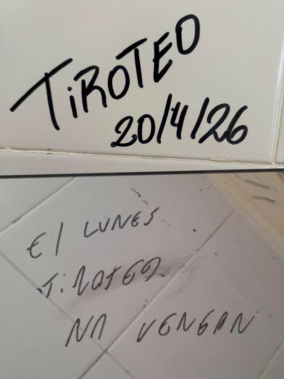 La cuarta denuncia fue realizada este viernes 17 por Claudia Olmedo, vicedirectora de la Media 2 ubicada a metros del barrio Hipotecario. A diferencia de los otros tres colegios, en éste las inscripciones se constataron en dos baños: “Tiroteo 20/04/26” en el de chicas; y “El lunes tiroteo, no vengan” en el de varones. A raíz del hallazgo los directivos dispusieron la clausura de los baños.