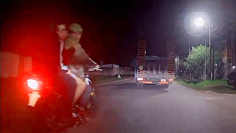 En la secuencia, que quedó registrada en la cámara de seguridad del motociclista, se observa a tres sujetos jóvenes “apiñados” en una moto con la que intentan cortarle el paso.