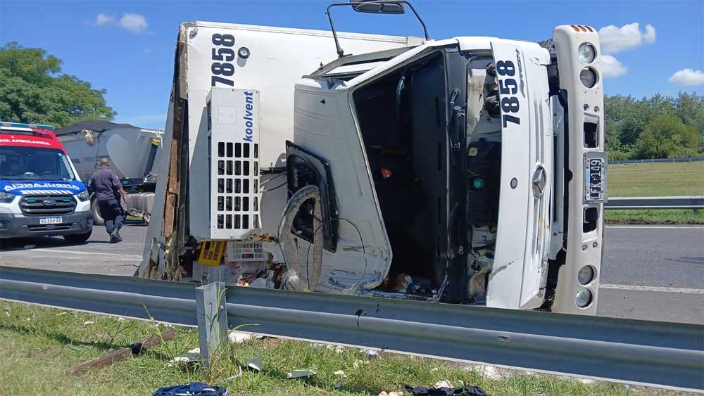 El Mercedes Benz modelo 693, patente LFK 149, quedó recostado sobre el lateral, con importantes daños en el habitáculo y la caja térmica.